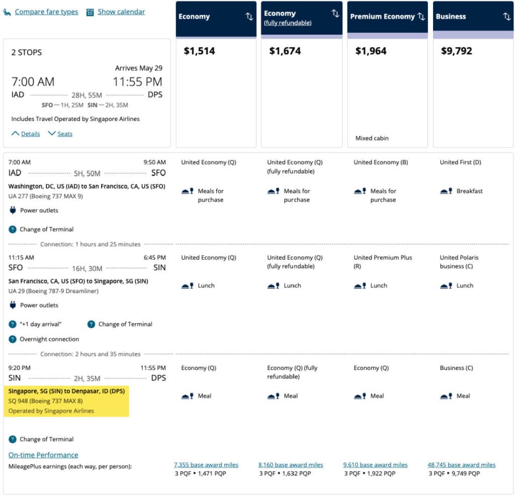 Here’s an example of a trip to Bali, which United doesn’t serve. When searching for a flight through the United website, you’ll notice that part of your journey is on United’s Star Alliance partner, Singapore Airlines.