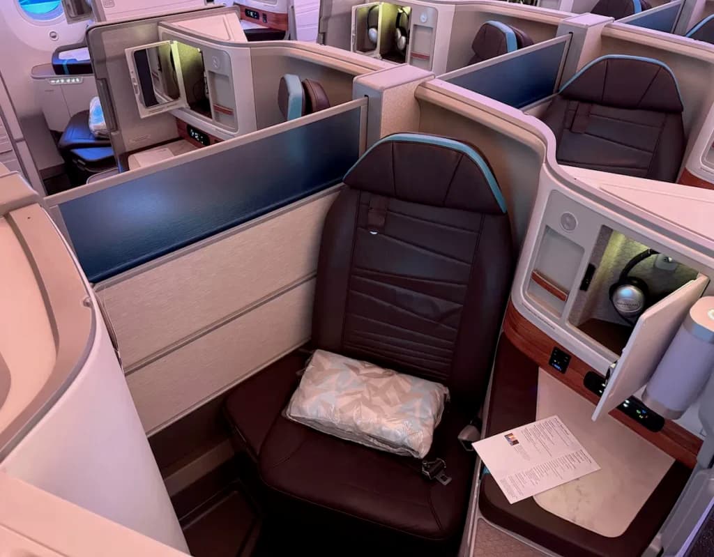 Boeing 787: This is Hawaiian’s first true international-caliber business class, but there are few of these aircraft in the fleet. They feature nine rows of lie-flat suites in a 1-2-1 configuration. Suites have a sliding divider door, and center section seats are angled away from each other, separated by a retractable privacy screen. The seats have integrated personal 18” HD touchscreens, a sconce reading light, and AC and USB charging ports, plus a Qi wireless charging pad (these can charge slowly and be a bit fussy with the positioning of the device).