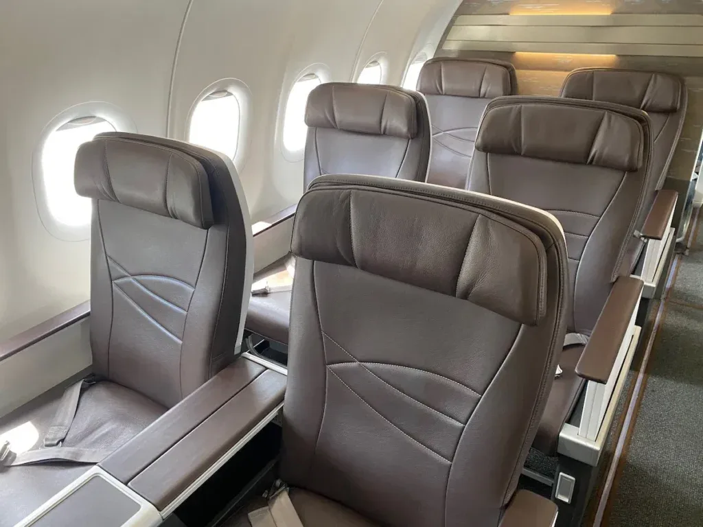 Boeing 717: Two rows of basic leather recliners in a 2-2 configuration, with better seat pitch than the Main Cabin. Tray tables are in the armrests. These seats are designed without flashy amenities because the flights are so short. It’s also worth noting that the legroom in the first row at the bulkhead isn’t great.