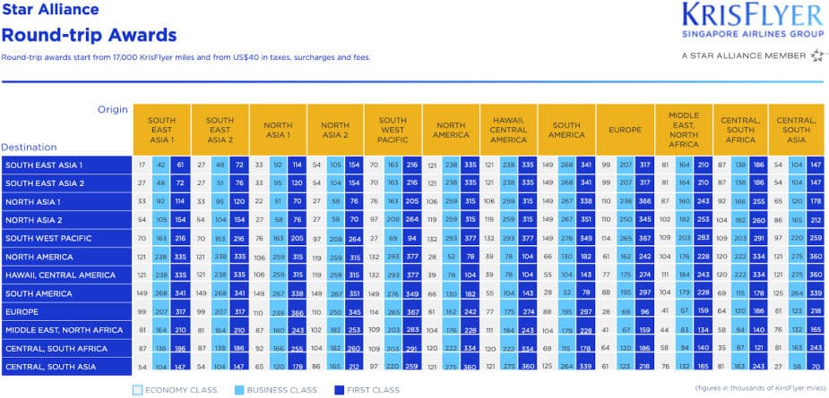 | Singapore Airlines (Star Alliance) | 14,000/26,000 | 30,500/81,000 |