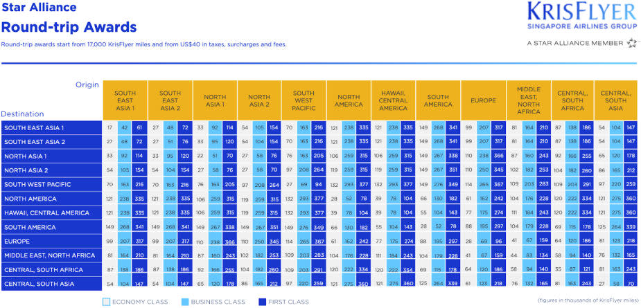 | Singapore Airlines (Star Alliance) | 14,000/26,000 | 30,500/81,000 |
