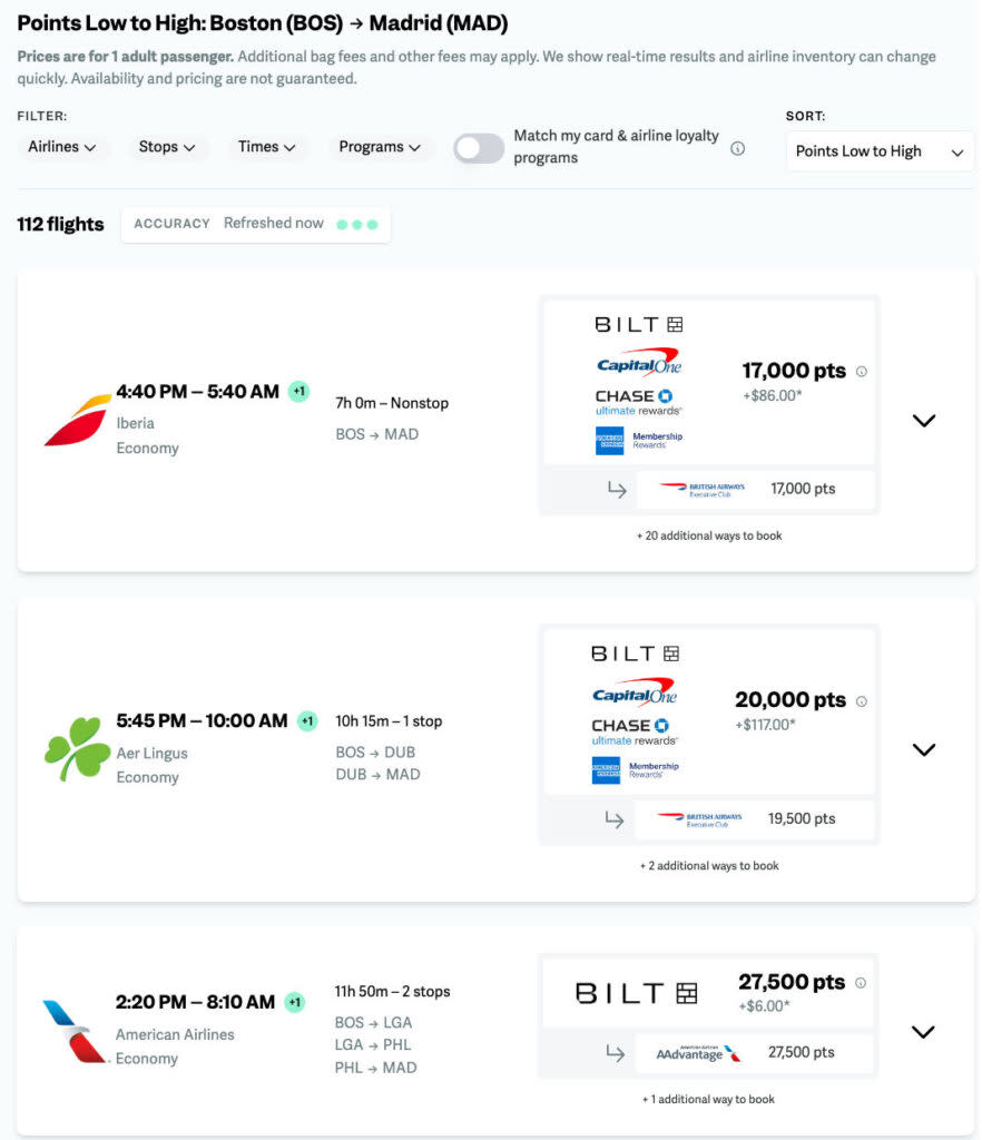 Flexible points can be transferred to a variety of partner airline loyalty programs — just choose the participating airline program you want to book through, choose the number of points you want to transfer, and you’ll find the miles in your airline account, often immediately. How do you know which partner to transfer your points to? First, do a flight award search with a tool like point.me that checks hundreds of airlines and dozens of loyalty programs, then select the best option for you, transfer your points, and book directly with the airline.