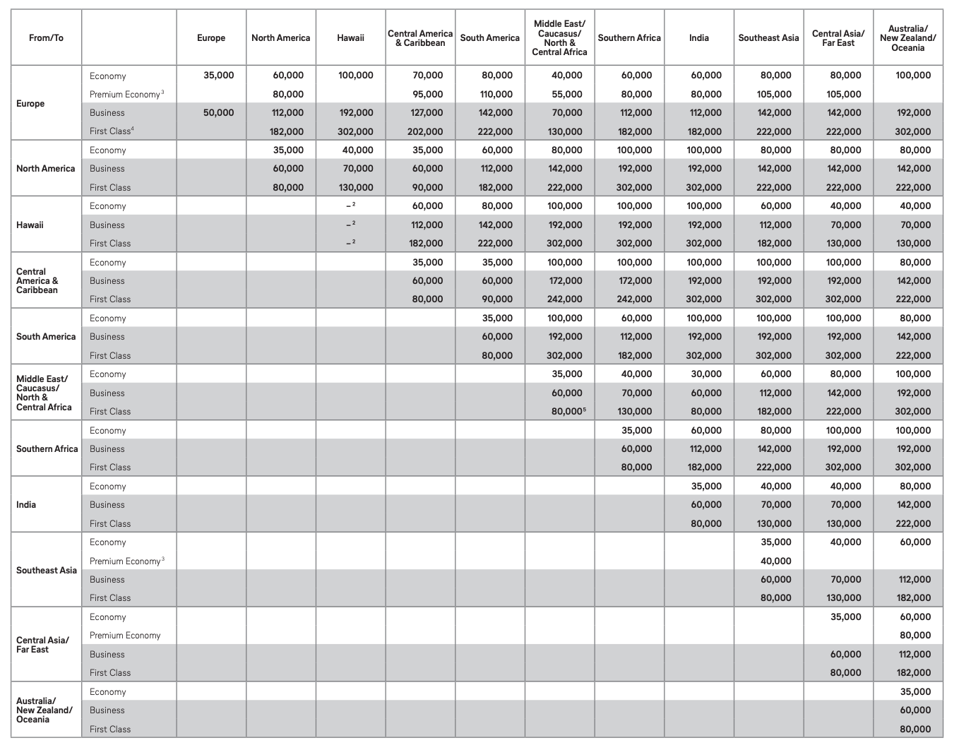 For U.S. travelers, Advantage awards start from 40,000 miles one-way for an economy seat to Europe and go all the way up to 302,500 miles for a suite or first-class seat to Japan, South Korea, Australia, or New Zealand.