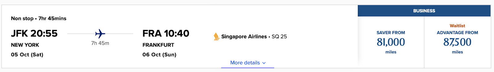 You’ll need as few as 81,000 miles for a one-way business-class Saver fare and only 6,500 more for an Advantage fare — significantly less than you’d pay to get all the way to Singapore.