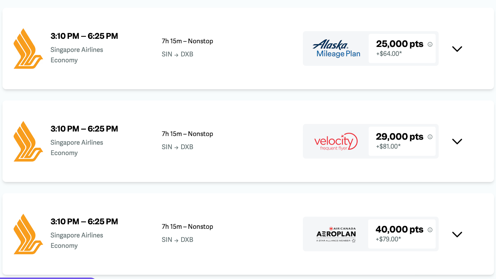 Singapore Airlines also keeps a handful of non-alliance partners, including Alaska Airlines. Again, point.me's search system comes into play here, showing you the best pricing for your Singapore Airlines award ticket when booking with a partner.