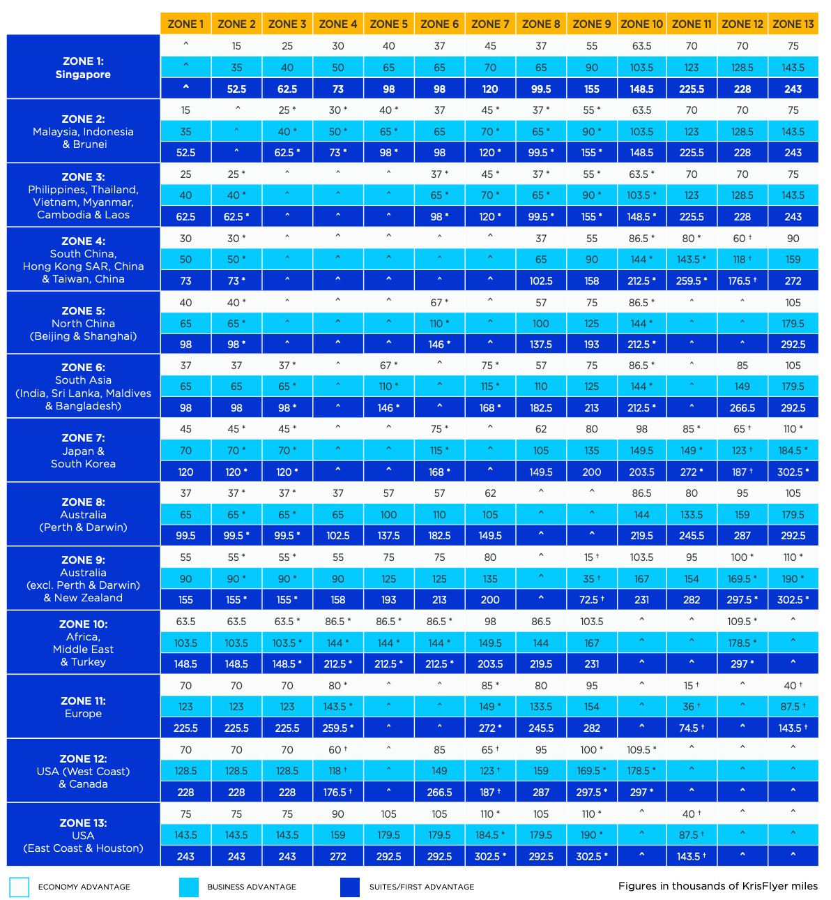 Singapore Airlines maintains an award chart, unlike many other airlines. To get a free flight, you'll need to spend at least 15,000 KrisFlyer miles — and the rates only go up from there.
