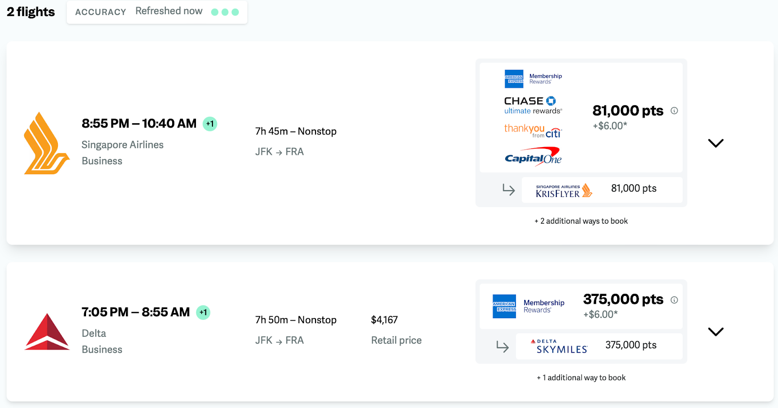 To find award availability using KrisFlyer miles, you can search directly on Singapore's website or use point.me, which searches all available airlines to reveal the ultimate way to redeem your rewards, whether it's via Singapore KrisFlyer or another loyalty program entirely — and as you can see, there can be a ton of variation depending on the frequent flyer miles you’re looking to use.