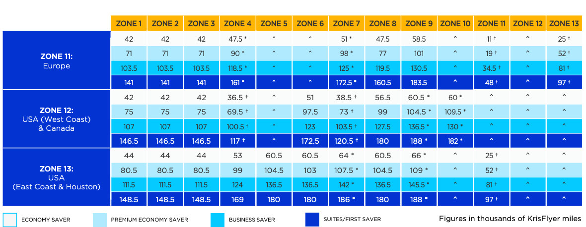 Redemption rates for Saver fares run the gamut, from 25,000 KrisFlyer miles for an economy seat on a nonstop flight between the eastern U.S. and Europe to 188,000 miles for a suite or first-class seat from the East or West Coast to Japan, South Korea, Australia, or New Zealand.
