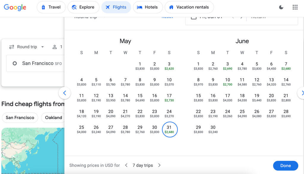 For paid business-class deals, Google Flights is the most comprehensive tool. It lets you set price alerts and search for the cheapest flights between cities six months out. You can even use the “Explore” tool to look for the cheapest flights out of a specific airport to any destination. If you do have a destination and dates in mind, you can use the calendar to see if moving your travel plans by a few days can result in cheaper fares.