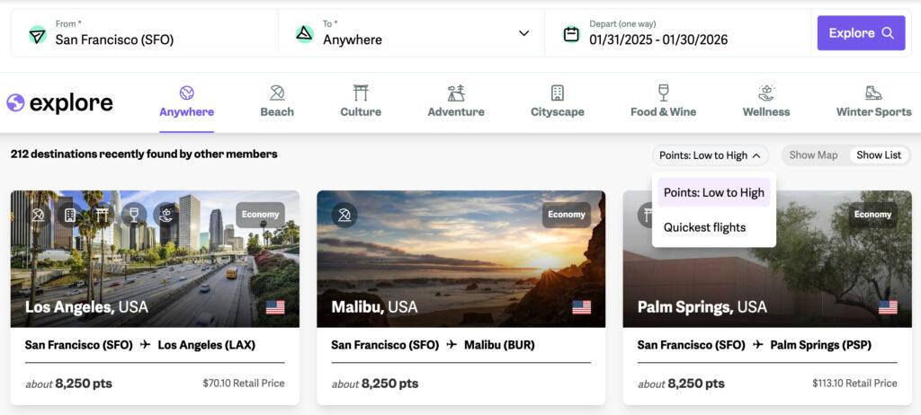 Whether you’re looking to pay cash or redeem points, there are several tools to help you find cheap business-class flights. point.me is an excellent tool if you want to find the cheapest business class fares using points and miles. The free version lets you search for cheap award flights using the “Explore” function, which is perfect if you’re flexible with your travel dates. You can set your home airport and a range of travel dates and sort the result by cheapest or quickest flights.