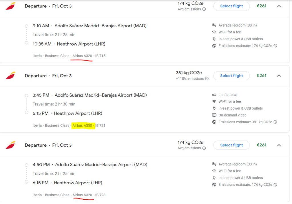 Googling and researching your flight route and airline is a reliable way to get more information. For example, years ago, I realized through some online searching that Iberia usually operates its flights between Madrid (MAD) and London (LHR) on a narrow-body A320. However, Iberia operates one flight each day between these two European hubs on its wide-body A350.