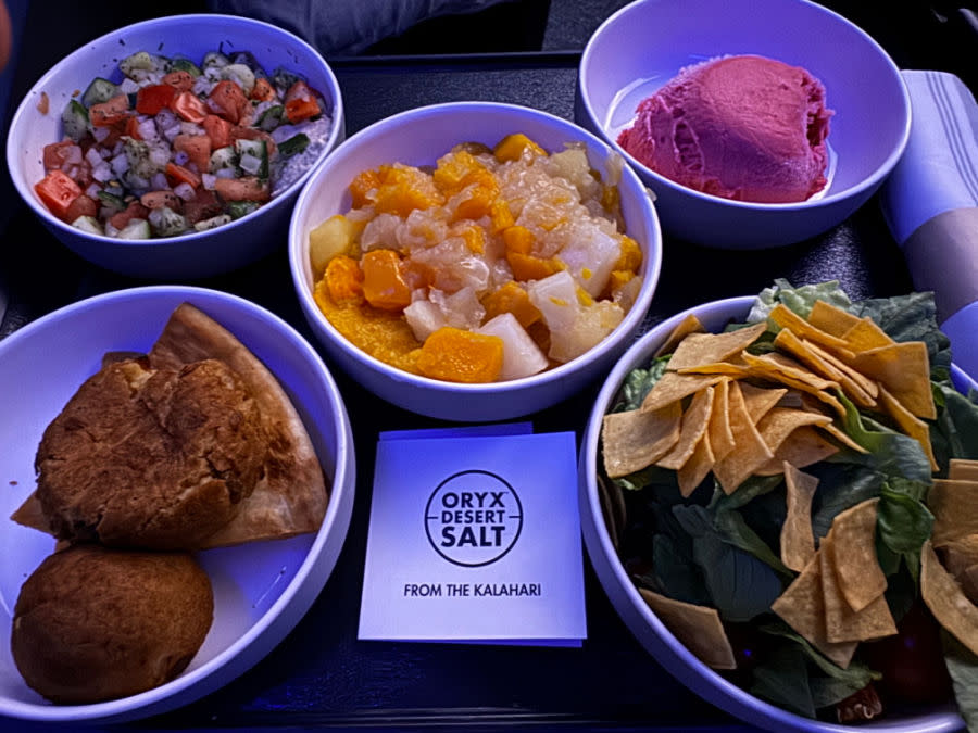 Travelers in Mint can expect a full, hot meal during the flight, and there may be a second, lighter meal on longer flights as well. The meal service is extremely filling, including a salad, starter, main dish, and dessert.