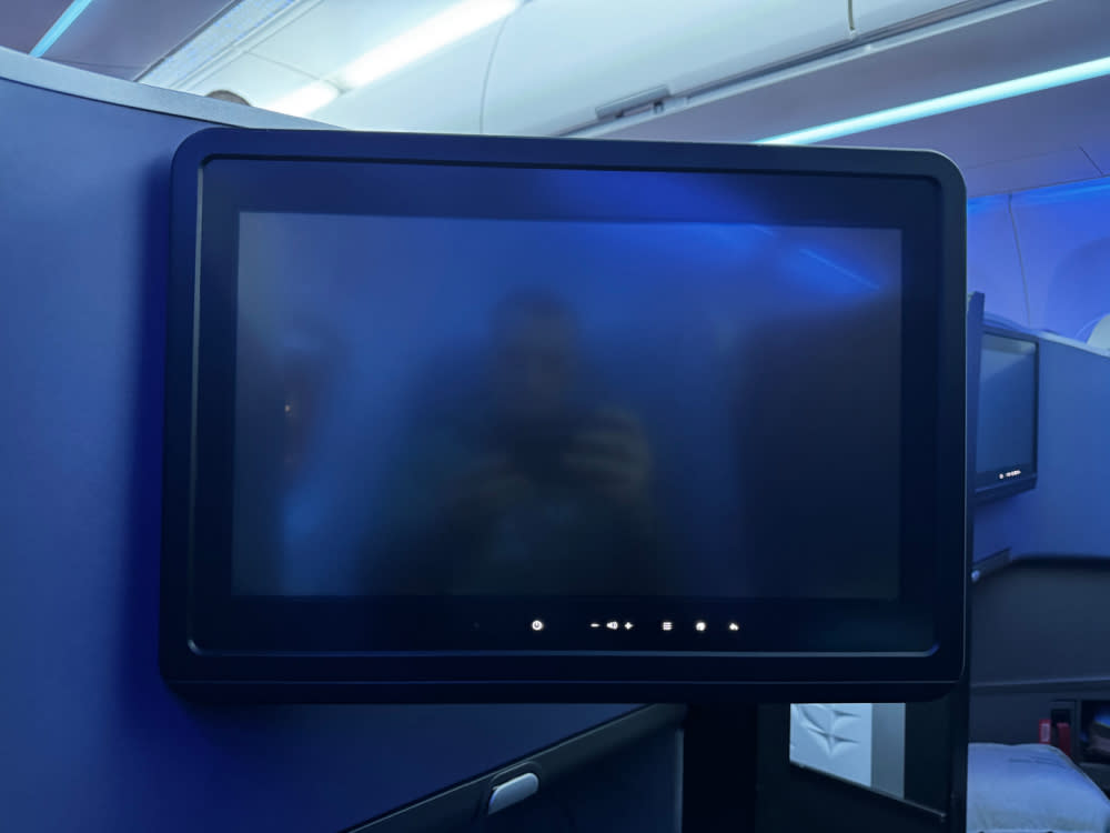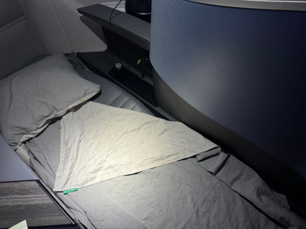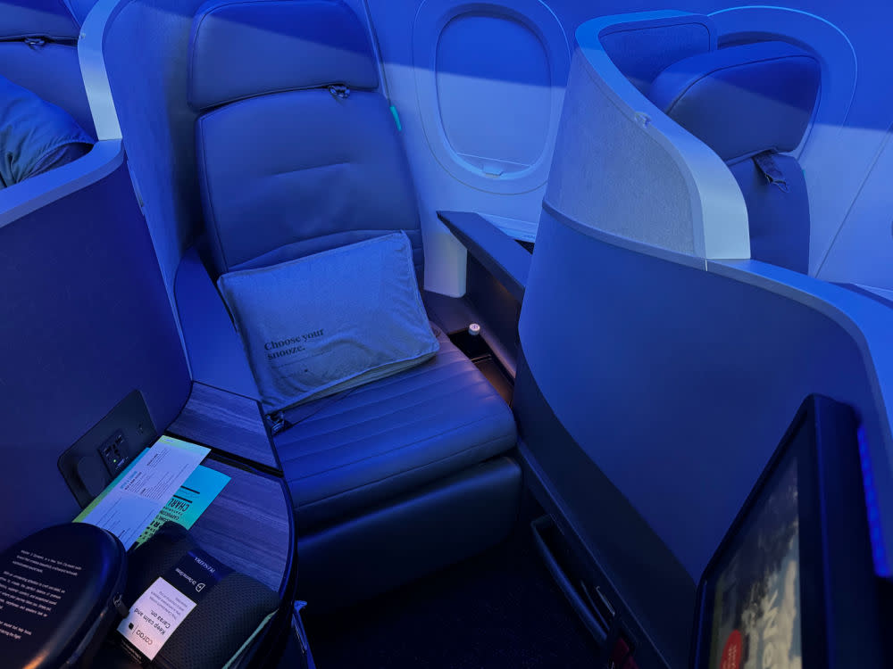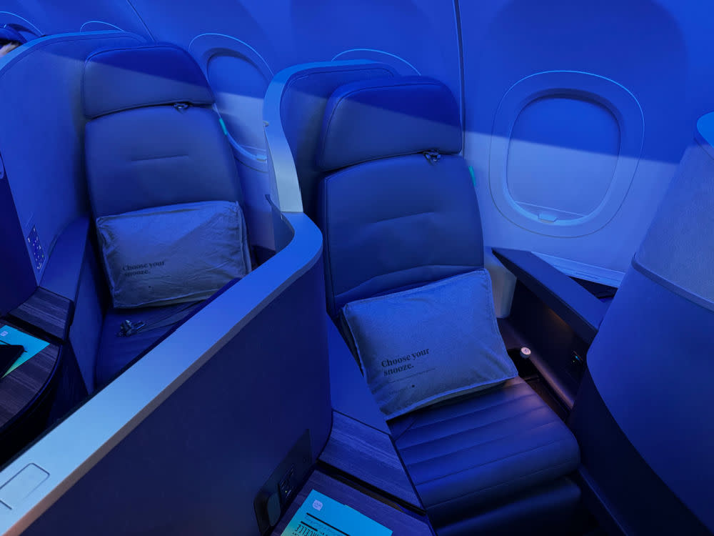 These seats have their own entertainment screens, reading lights, push-button controls, universal outlets, and other modern touches. You’ll also find a set of noise-canceling headphones and Tuft & Needle bedding on the seat during boarding.