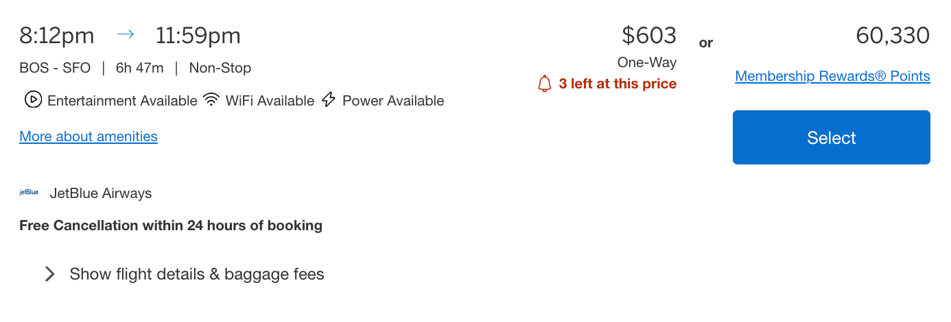 For example, here’s that same flight from Boston to San Francisco, costing 60,330 Amex Membership Rewards points – a value of 1 cent per point.