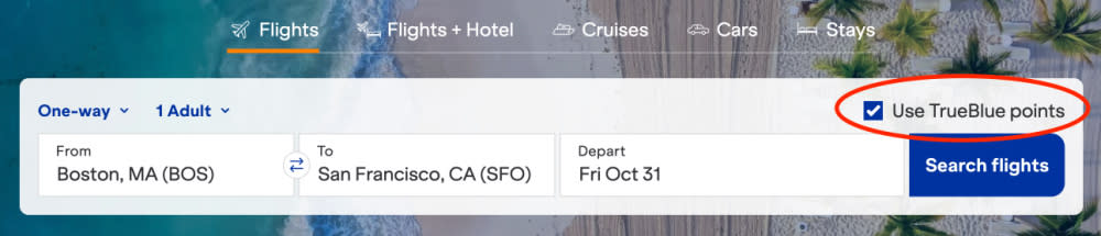 To book a Mint ticket with TrueBlue points, head to JetBlue's website and input your travel details, including the number of passengers, route, and travel date. Be sure to select whether you want a one-way or round-trip booking. Then, click the “Use TrueBlue points” option before clicking the button to search for flights.