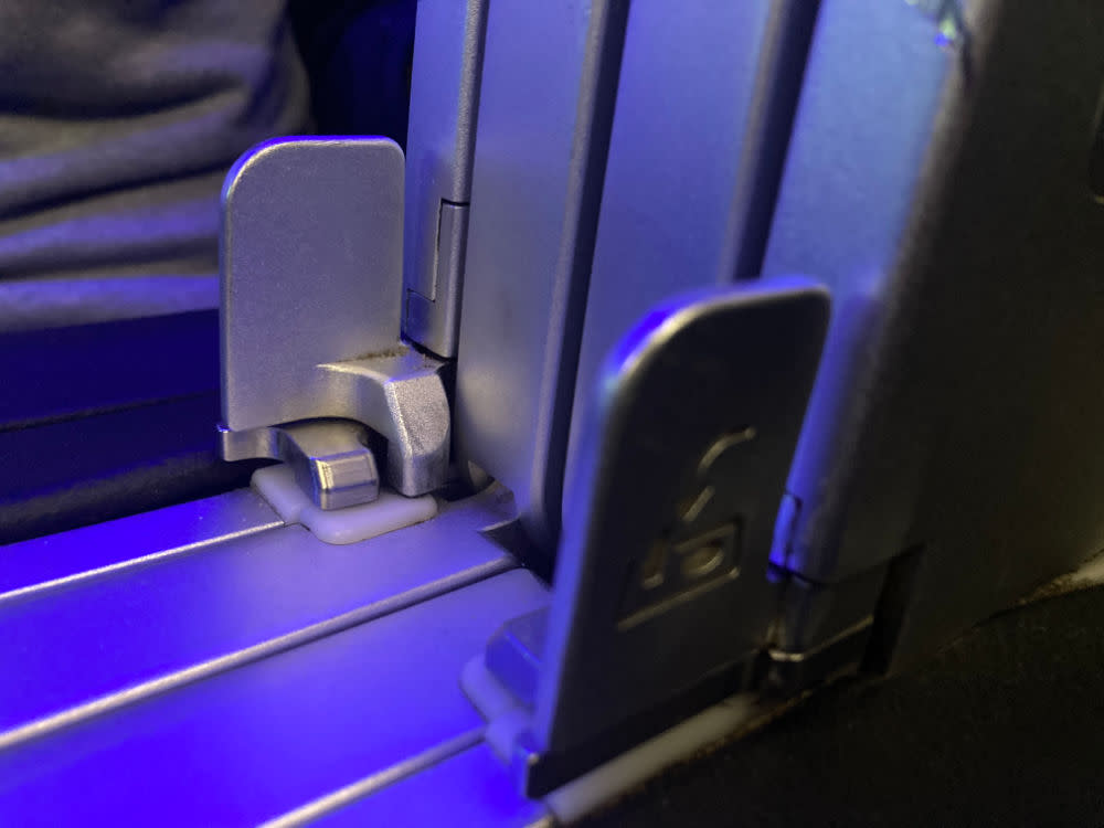 The one drawback in these seats is that the tray table releases from the space between the passengers’ shoulders via a latch, and it can fall with a thud, waking passengers who are sleeping nearby.