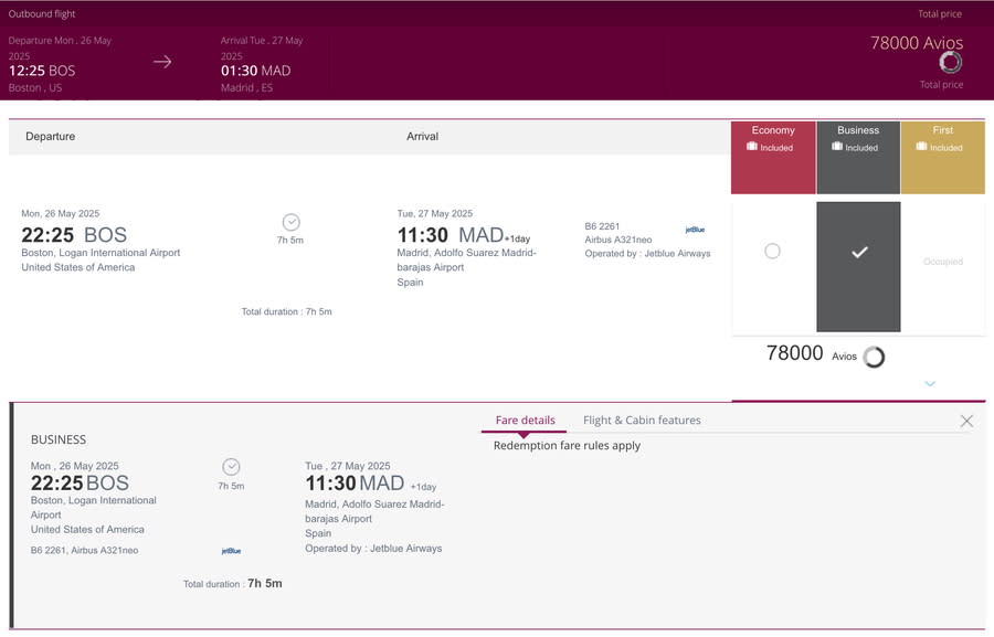 Consider a flight from Boston to Madrid, for which JetBlue charges 107,000 or more points on most days.