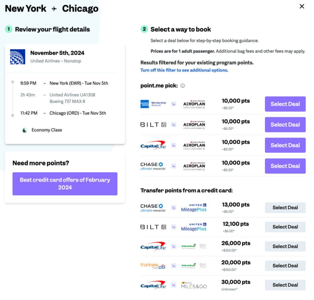 At this step, you’ll notice two things. point.me will show you eligible Aeroplan transfer partners if you don’t have enough rewards for your flight. It’ll also suggest other rewards programs you can use to book the exact same flight. As you can see, it’s possible to use United Airlines miles, EVA Air miles, or TAP Portugal miles for your award — though all are more expensive.