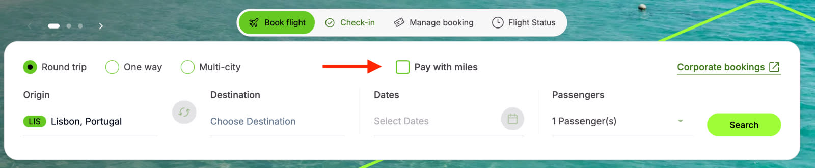From TAP’s home page, you can search for a flight as you normally would and then check the “Pay with miles” box after entering your flight details and the number of passengers. Then, click “search.”