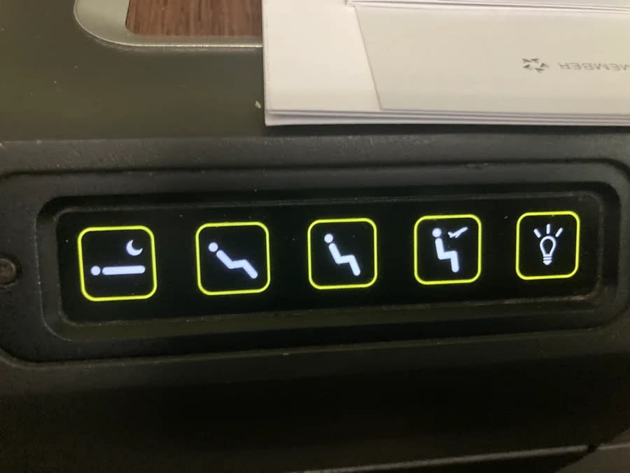 Passengers will find push-button seat controls to recline, lie flat, sit up, or turn on the overhead light. However, it’s not possible to control pieces of the seat independently, such as lumbar support or a massage function found on other airlines.