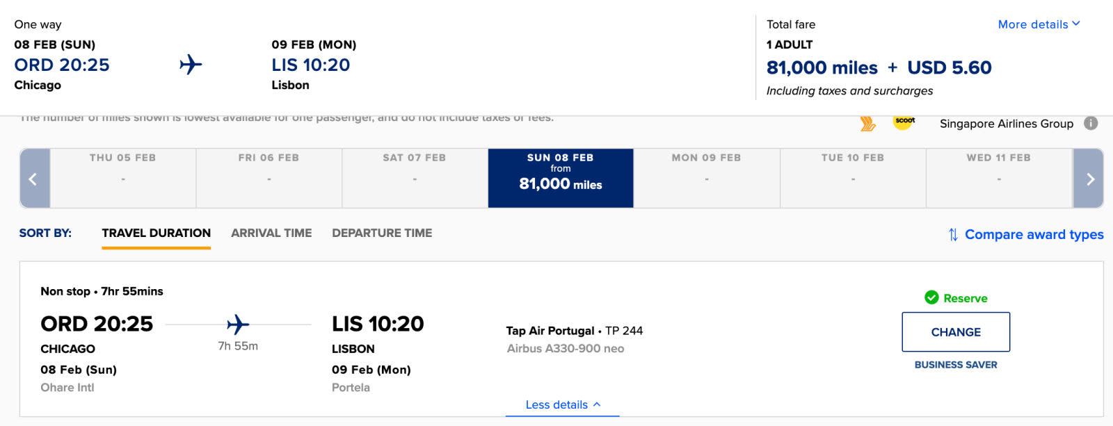 LifeMiles charges 80,000 miles plus $28.50 for the Chicago-Lisbon flight, while KrisFlyer charges 81,000 miles plus $5.60 in taxes.