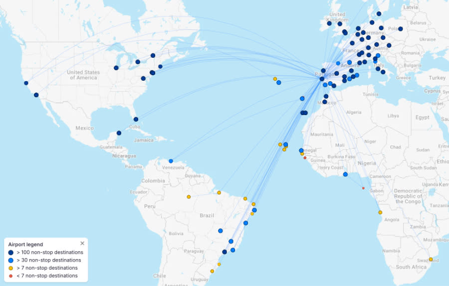 TAP Portugal flies to more than 80 destinations in over 30 countries from its home bases in Portugal, mostly out of Lisbon (LIS), including strong networks to both Africa and South America.