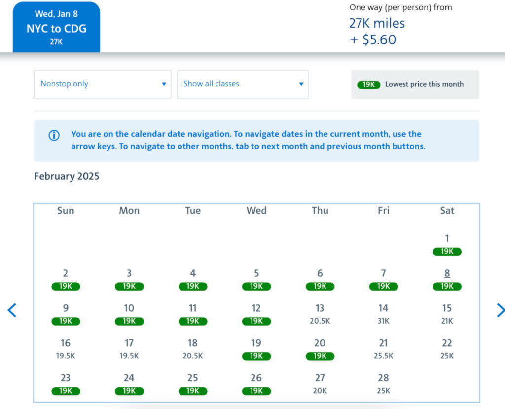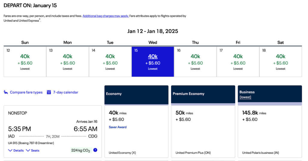 On its own metal, you’ll find decent economy and even premium economy prices, such as this flight from Washington (IAD) to Paris (CDG), starting at just 40,000 miles each way.