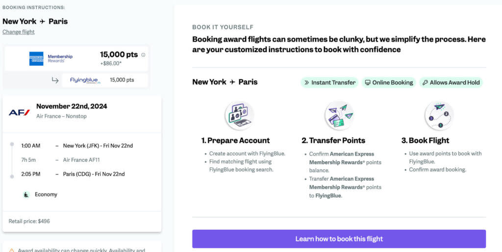 Select your preferred flight. Any transfer bonuses will be noted, and you’ll also see the programs you can use to transfer points.