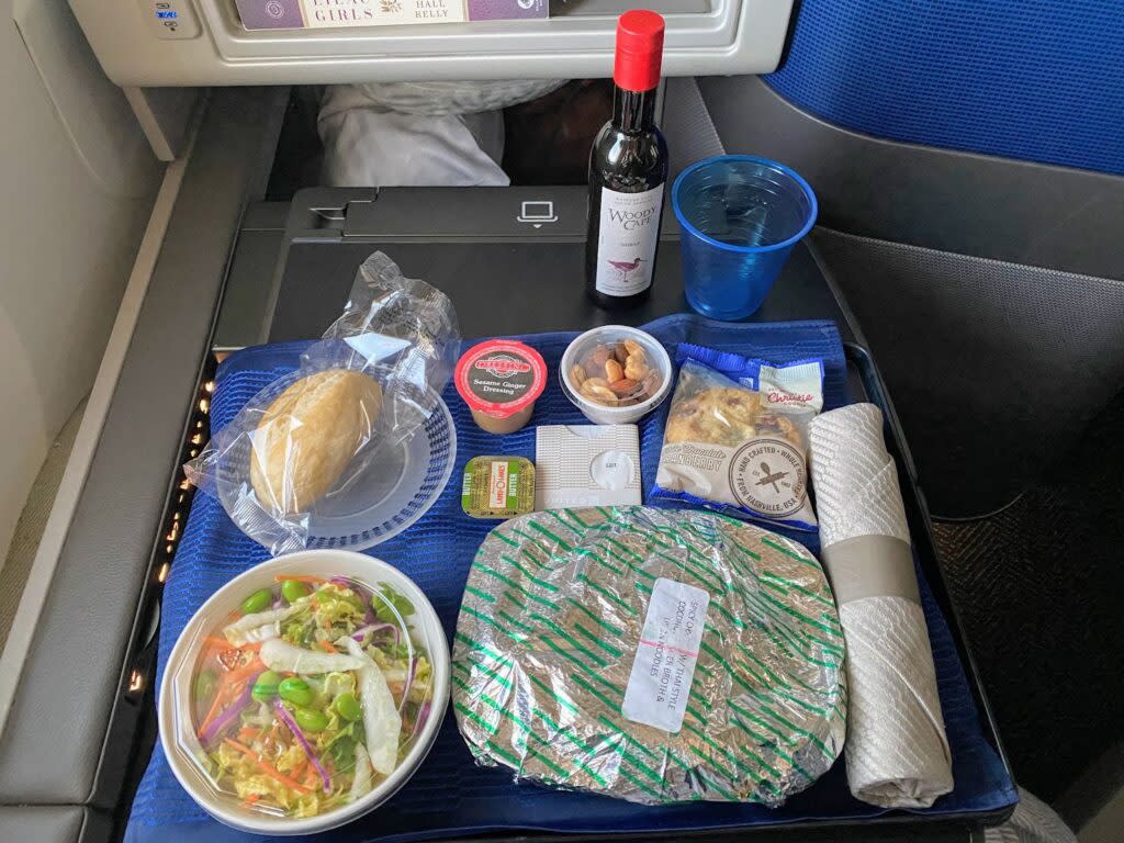 Your menu will vary based on where you’re flying. You’ll be served after takeoff and again later in the flight. A standard meal comes with multiple courses: an appetizer, salad, bread, entrée, and dessert (sundaes made to order). Alternatively, you can ask for “express dining” to be served all of your courses at once. It’s less pomp, but it’s convenient if you’ve got work (or sleep) to accomplish.